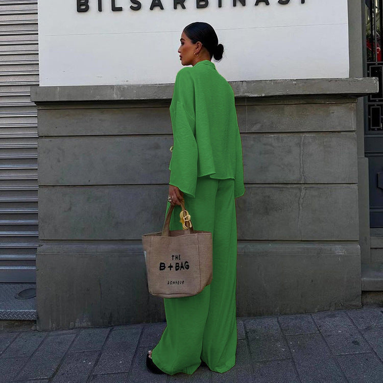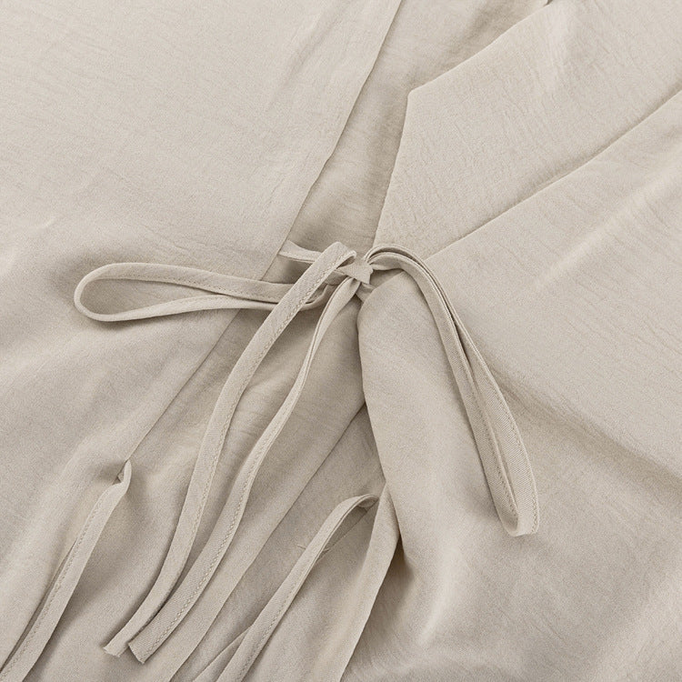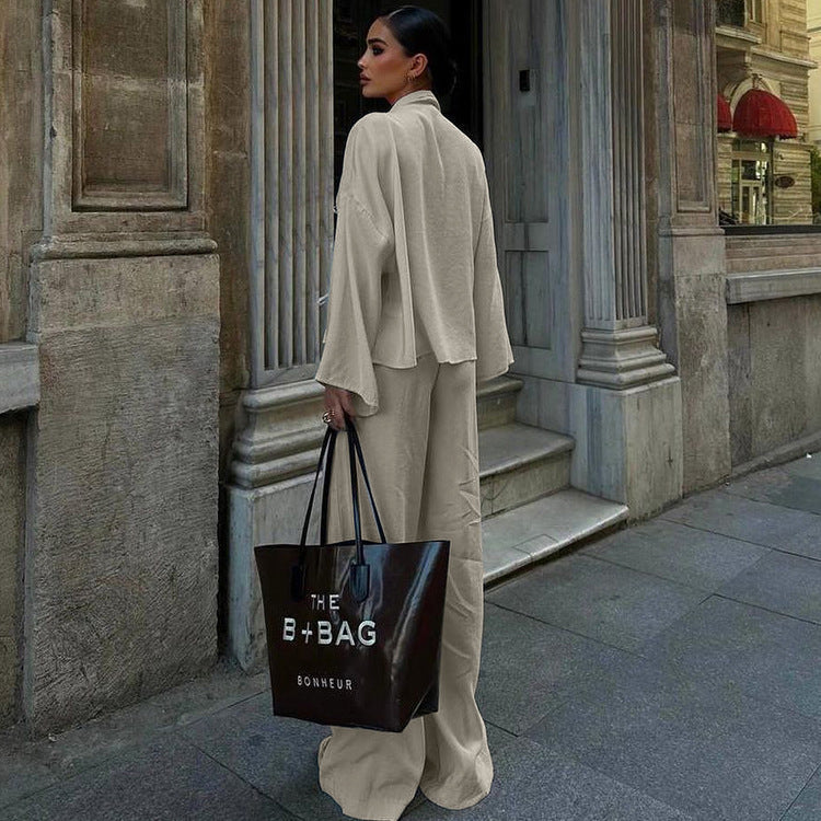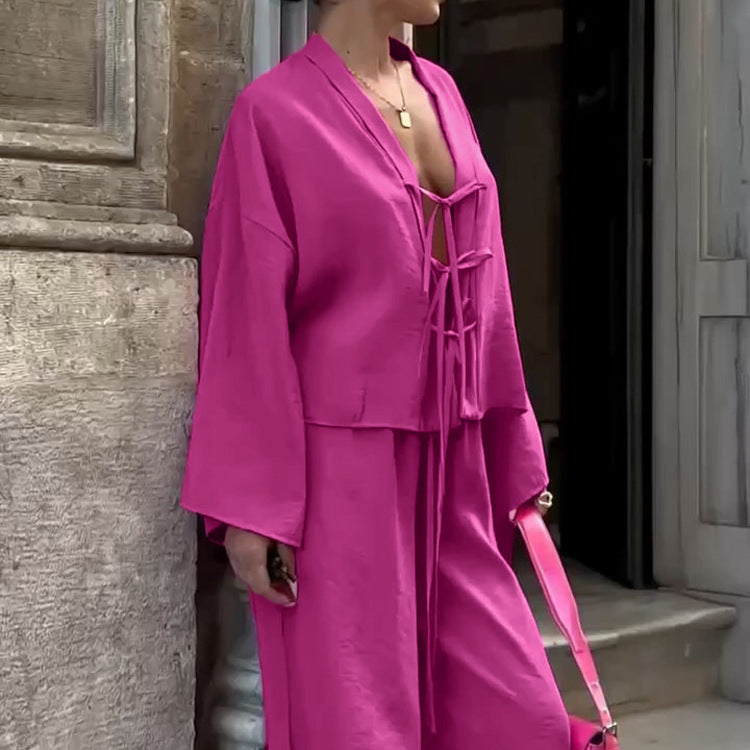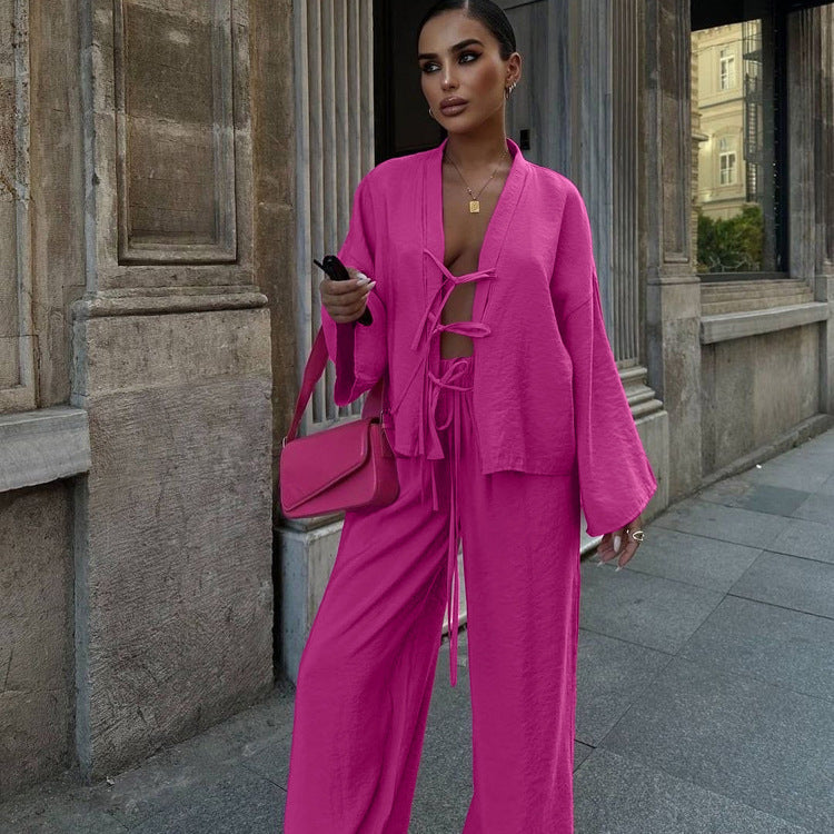 Geniş yakalı ve bağcık detaylı üst tasarımı, klasik ve modern tarzı bir araya getirirken, bol paça pantolon ile kusursuz bir uyum yakalar. Günlük kombinlerde veya özel davetlerde rahatlıkla tercih edilebilir.