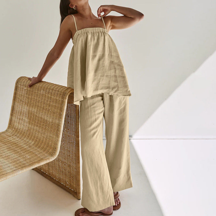 Askılı, bol kesim üstü ve geniş paça pantolonu ile hareket özgürlüğü sunan bu takım, minimal tarzıyla zamansız bir şıklık yaratır.