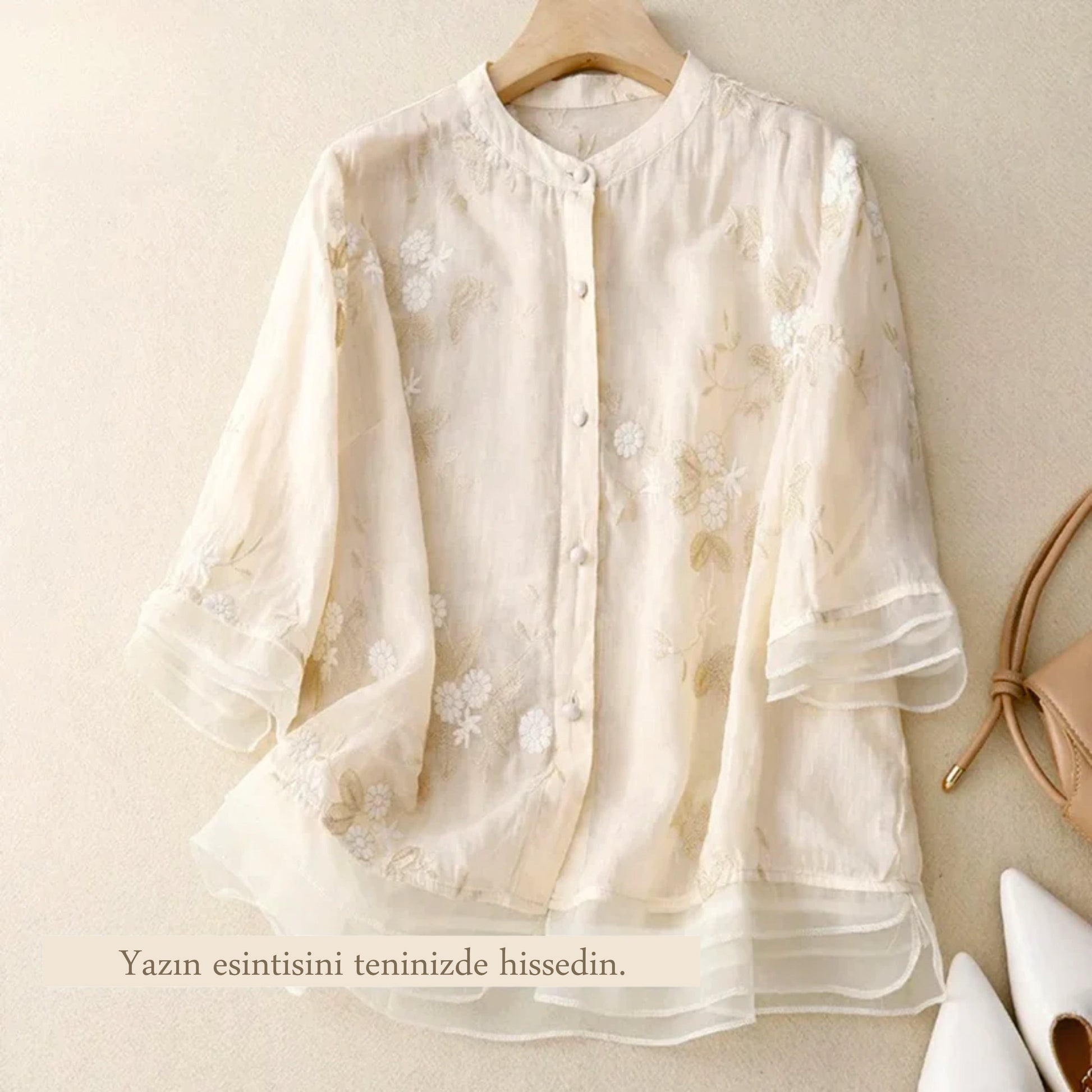 Bu pamuk ve keten kumaştan yapılmış, narin çiçek işlemeleriyle süslenmiş bluz ile gardırobunuza yumuşaklık ve zarafet katın. Nefes alabilen kumaşı ve dökümlü kesimi ile günlük kombinlerinizin vazgeçilmezi olacak.