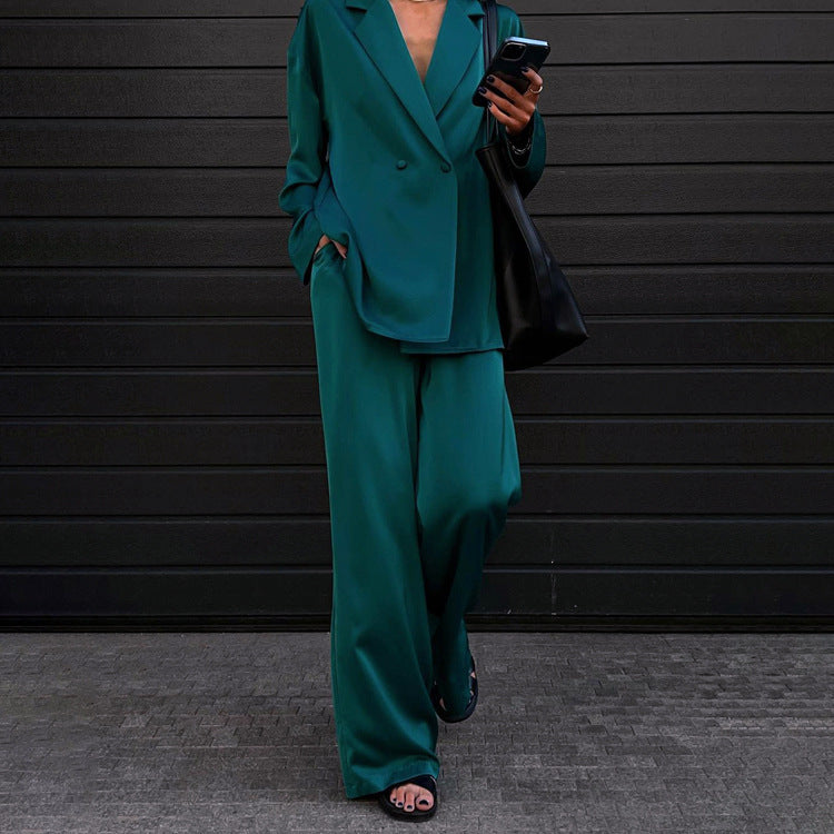Oversize ceket tasarımı ile özgüvenli bir duruş yakalayın. Geniş paçalı pantolonu sayesinde şık ve rahat bir görünüm elde edebilirsiniz.